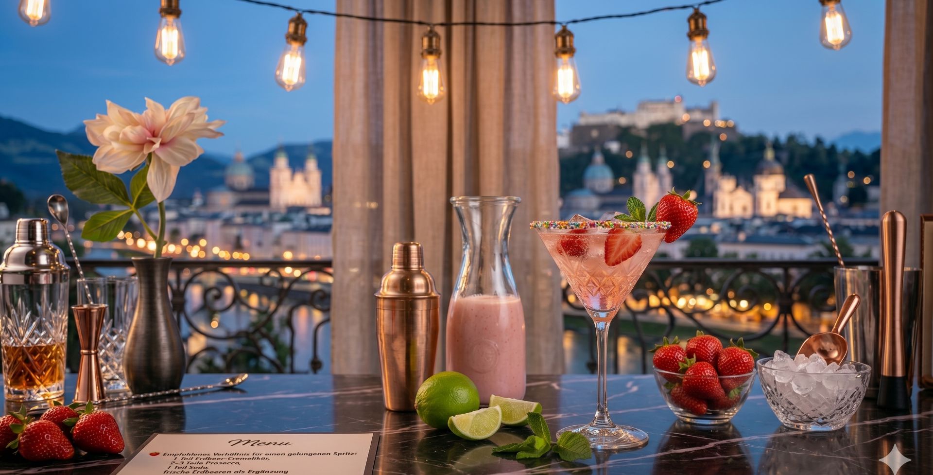 Für Gäste, die auf Alkohol verzichten möchten, lässt sich eine unkomplizierte Alternative mit Erdbeersirup und Soda anbieten, die optisch und geschmacklich überzeugt und sich nahtlos in das Gesamtbild integriert. Gleichzeitig sorgt eine liebevoll gestaltete Cocktailstation mit frischen Erdbeeren, Minze und farbenfrohen Strohhalmen für einen echten Blickfang und hebt die Präsentation auf ein neues Niveau. Stimmige Details machen den Unterschied und verwandeln jede Sommerparty in ein Erlebnis, das nicht nur geschmacklich begeistert, sondern auch visuell in Erinnerung bleibt.