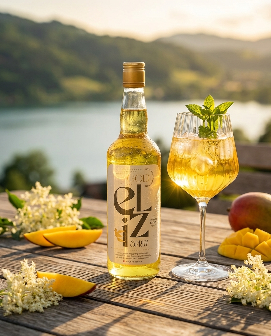 Eliz Sprizz ist ein Sommerbitter Aperitif – die perfekte Begleitung für Sprizz, Cocktails und Aperitif-Momente. Er vereint den exotischen Geschmack sonnengereifter Mango mit der eleganten Frische von Holunderblüte. Goldene Momente mit wenig Prozent – sommerlich, modern und überraschend anders.